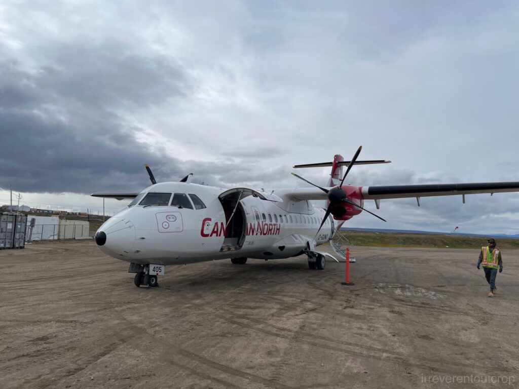 Our 2.5hr flight from Iqaluit to Pond Inlet crossed the entire length of Baffin island. It was over 1,000 km (660mi) long, roughly the same distance as from San Francisco to Seattle. Canadian North used a twin-engine turboprop ATR-42 aircraft for this flight. We picked window seats, hoping to see more of Baffin along the way, but unfortunately it was mostly overcast and we could only saw the landscape during takeoff and landing.