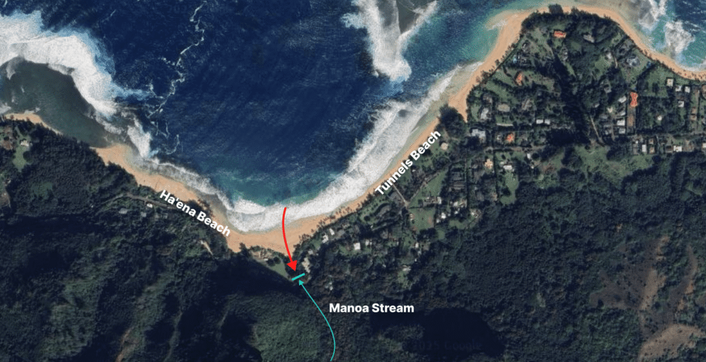 Manoa溪入海口的沙坝东、西两侧分别被称为和Tunnels和Ha’ena海滩,但其实是连在一起的。此处的沙坝完全封死了Manoa Stream的出海口,只有在涨潮时有的波浪会越过沙坝将河道部分短暂连通起来。