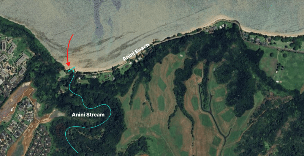 Anini Stream的潮汐通道在沙滩最西侧。从西边去的话,可以直接从威斯汀酒店下山走过去。而假如要开车去的话,则需要要先绕到东边Kalihiwai才能进来。Anini沙滩做南朝北,狭长,因为对出海底水不深,且有裙礁,所以是一处小有名气的浮潜胜地,不过主要的游人集中部分在沙滩中部和东部,靠近Kalihikai公园处,走到河口这边的人很少。