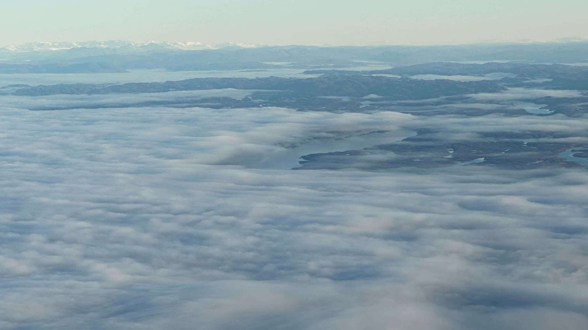 清晨的努克,乌云密布,但在飞机起飞后,我们能在云层上方,看到所有插入云霄的角峰。
