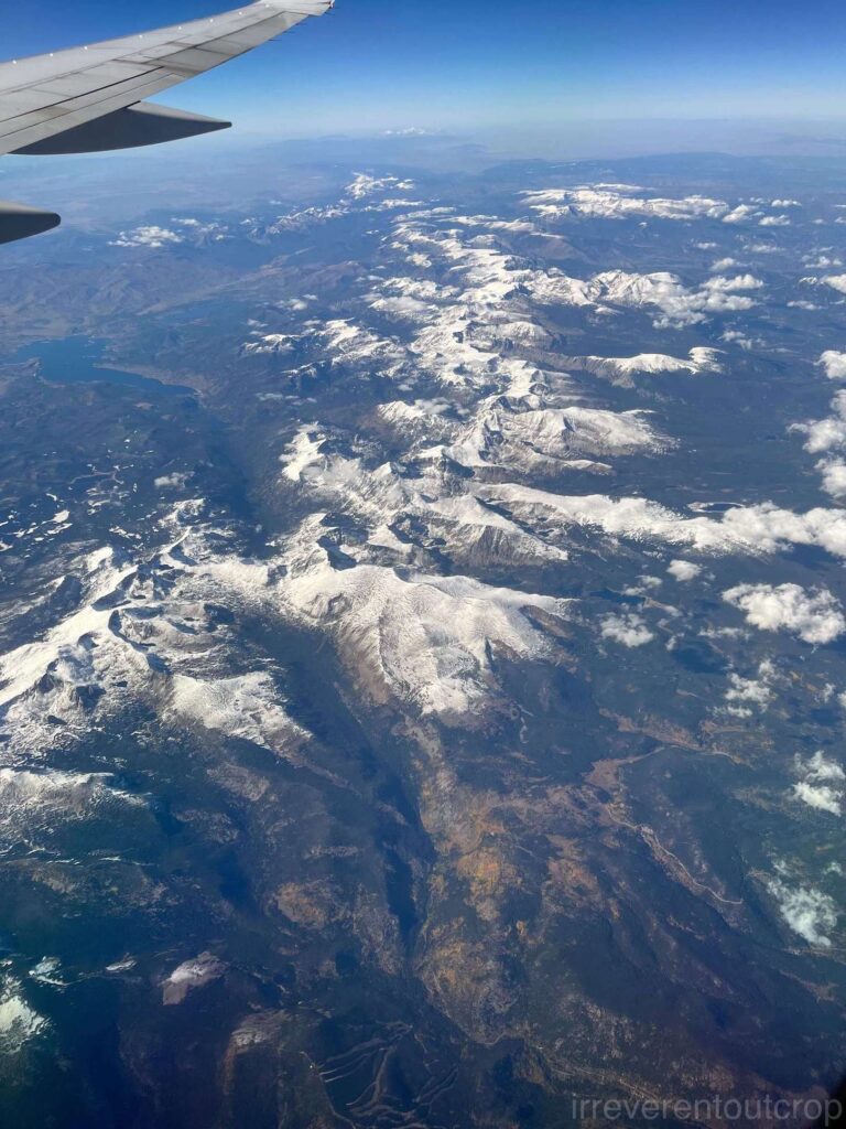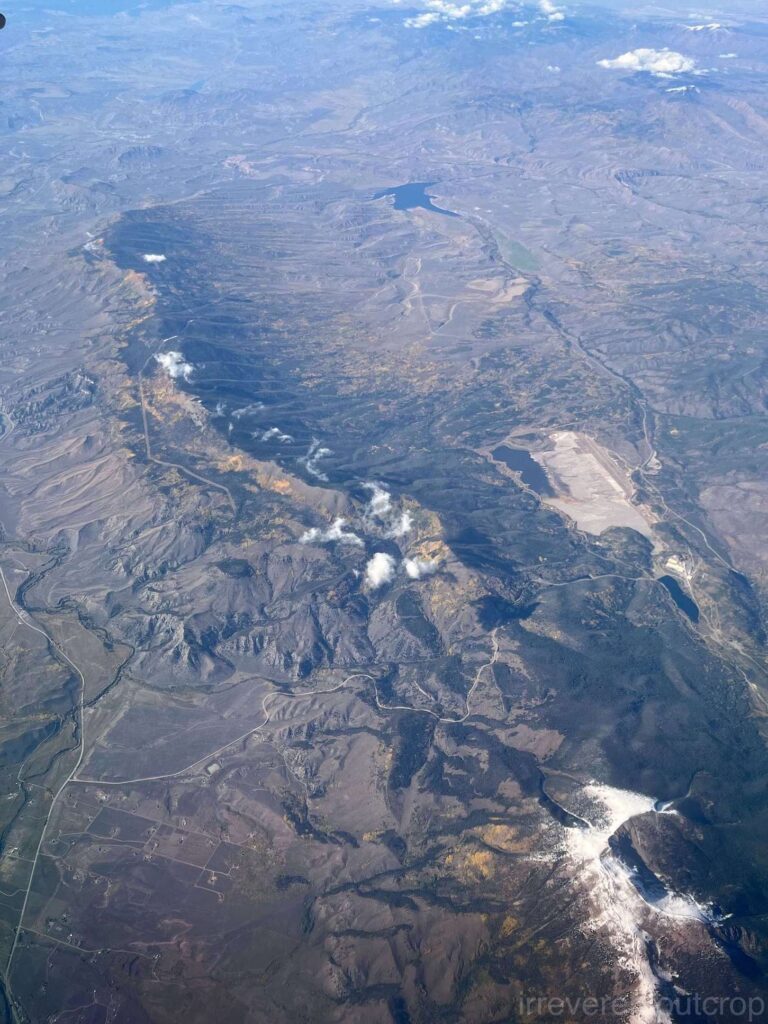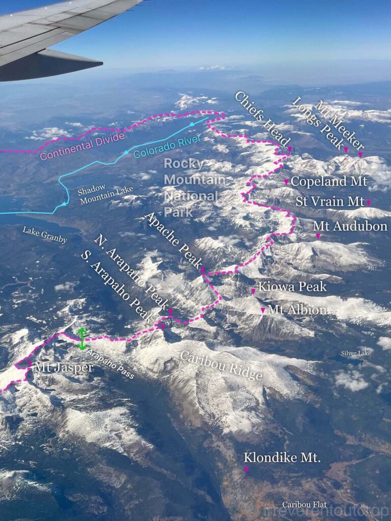 我们的飞机在丹佛以北进入落基山脉地区,向北看去可以看到落基山北段的一众山峰、落基山国家公园、以及科罗拉多河源头处的河谷。此处为北美大陆的分水岭中段,以西为太平洋流域,以东为大西洋流域。