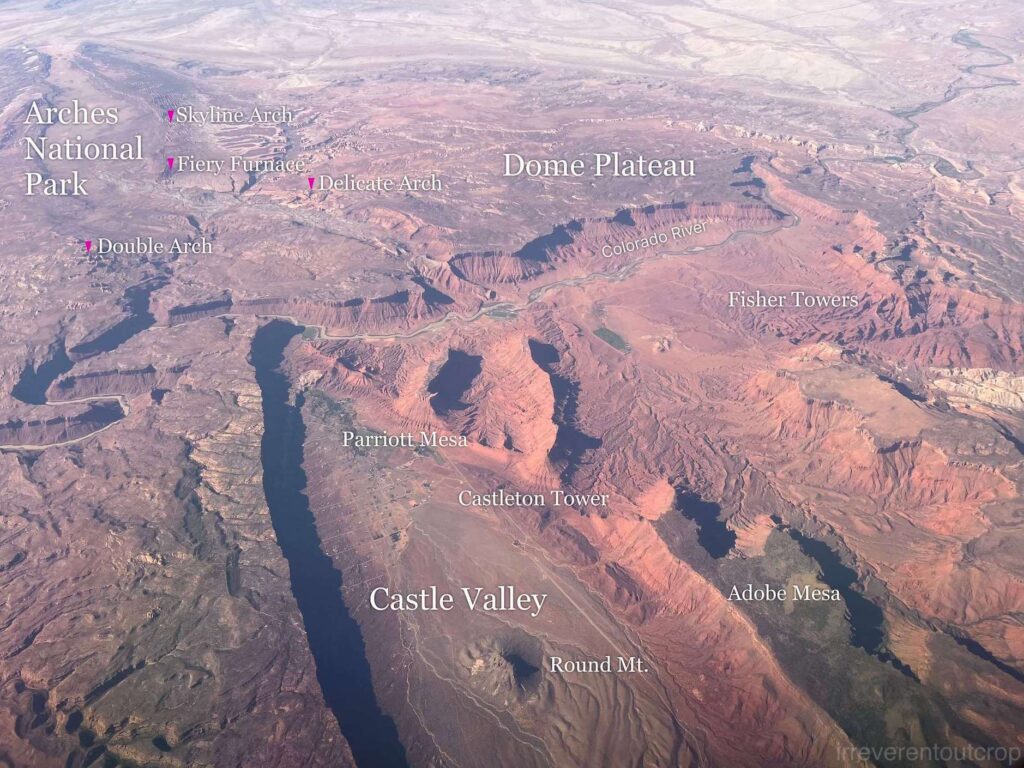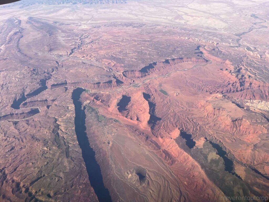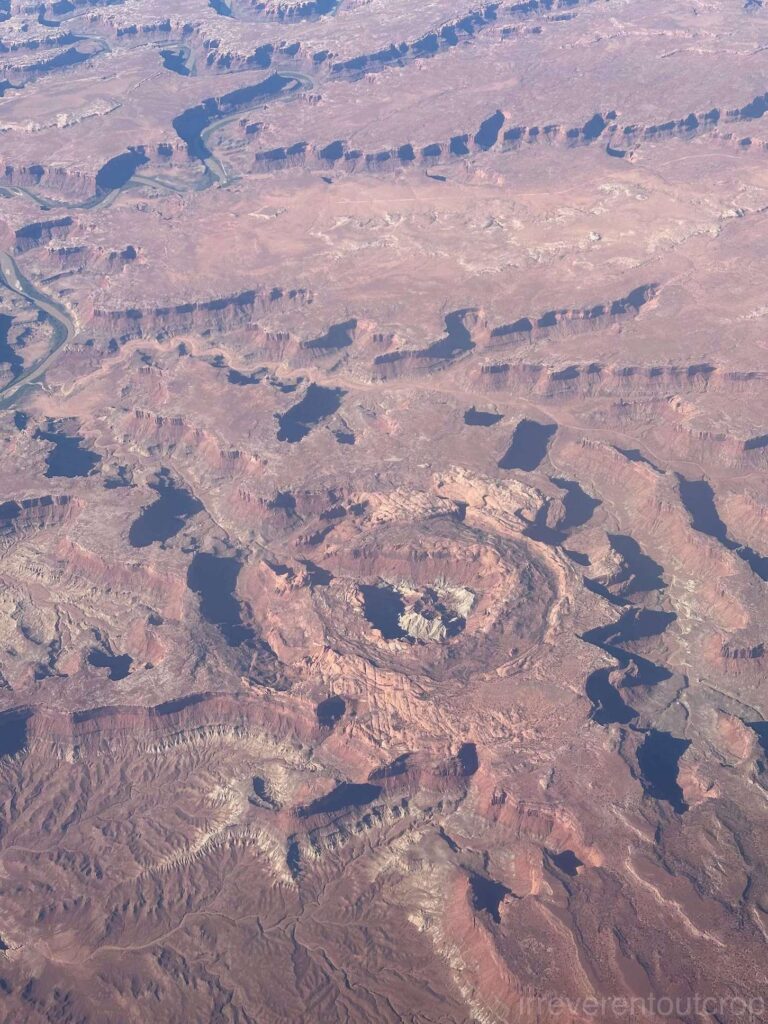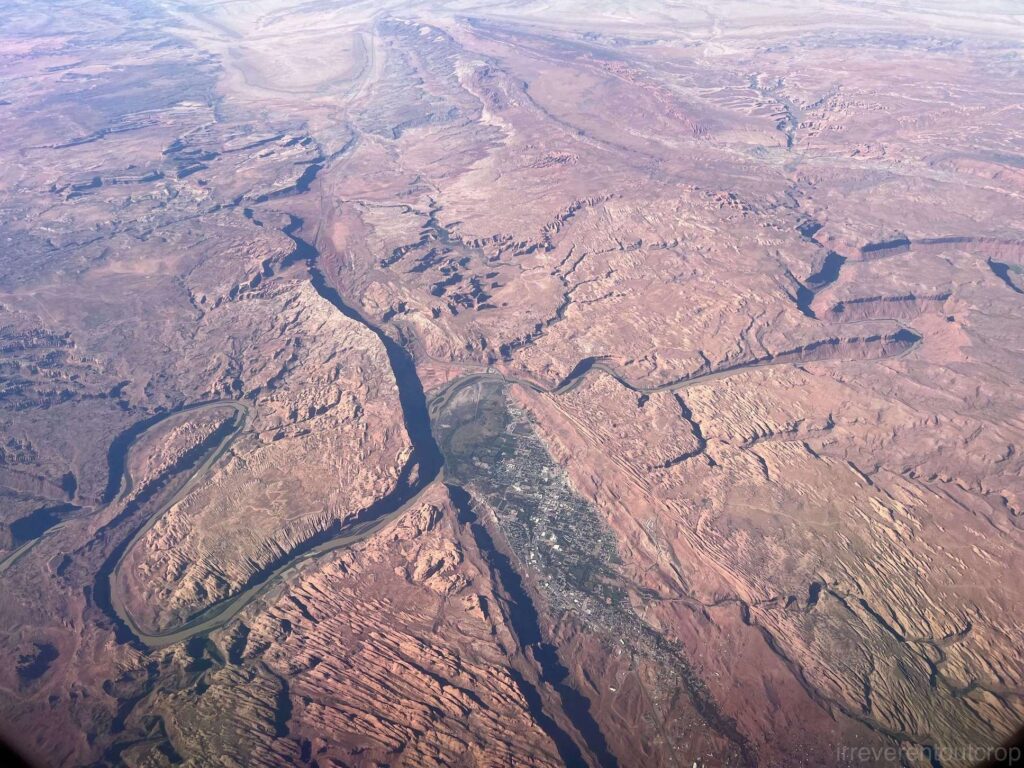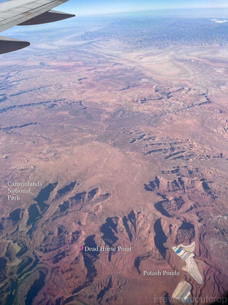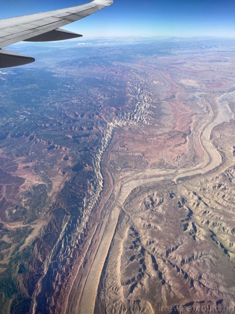 飞机继续向西飞行,在Moab以西,能看到峡谷地国家公园(Canyonlands National Park)全貌。我们2025年四月份刚去过,现在又从空中看一次,印象更加深刻了。