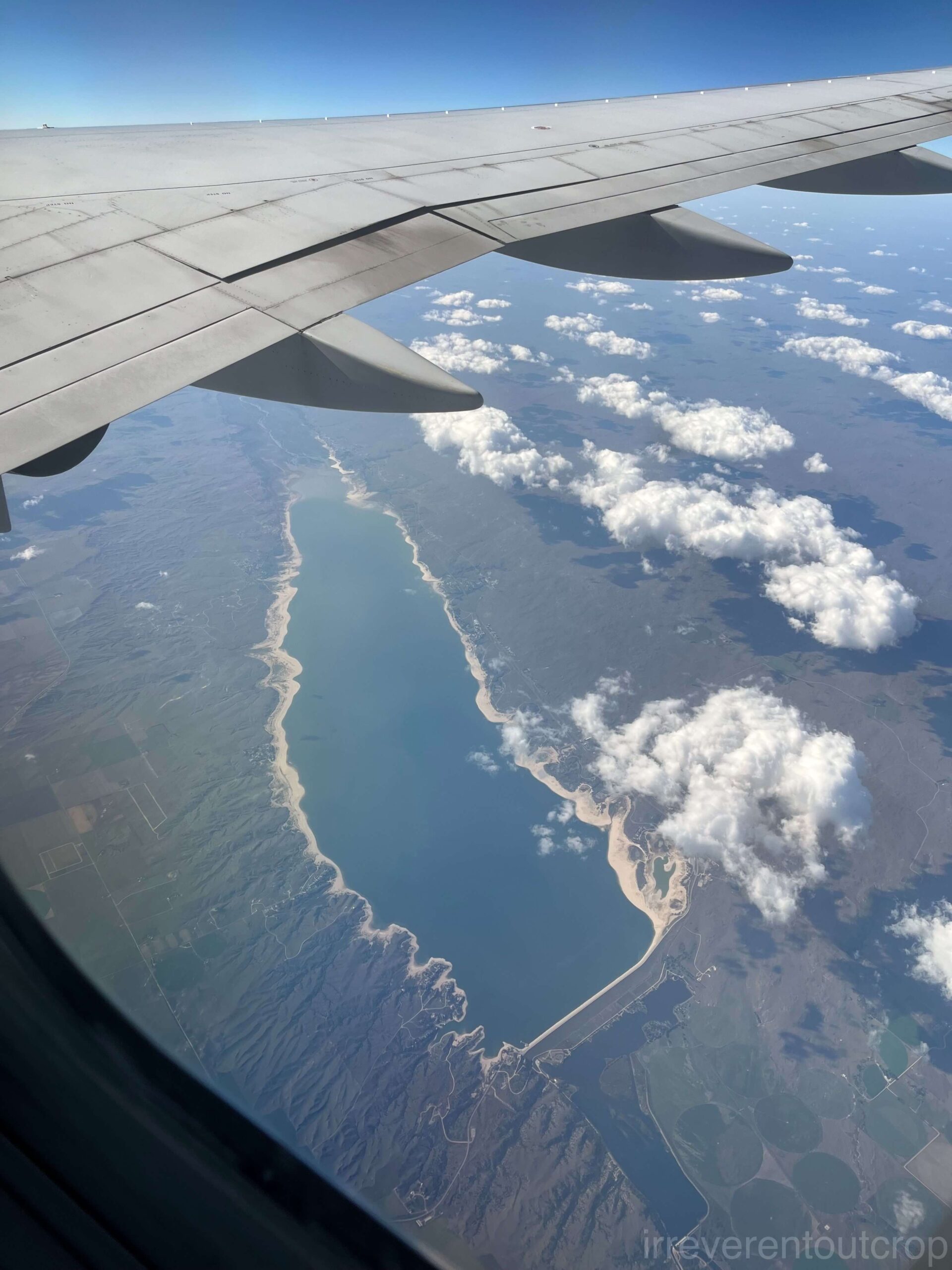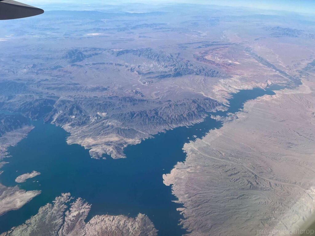 我们的航线在离开犹他州之后,进入了内华达州的最南端,刚好飞过Lake Mead上空。这个湖是胡佛水坝将科罗拉多河截出来的一段开阔水域,位于拉斯维加斯以东。