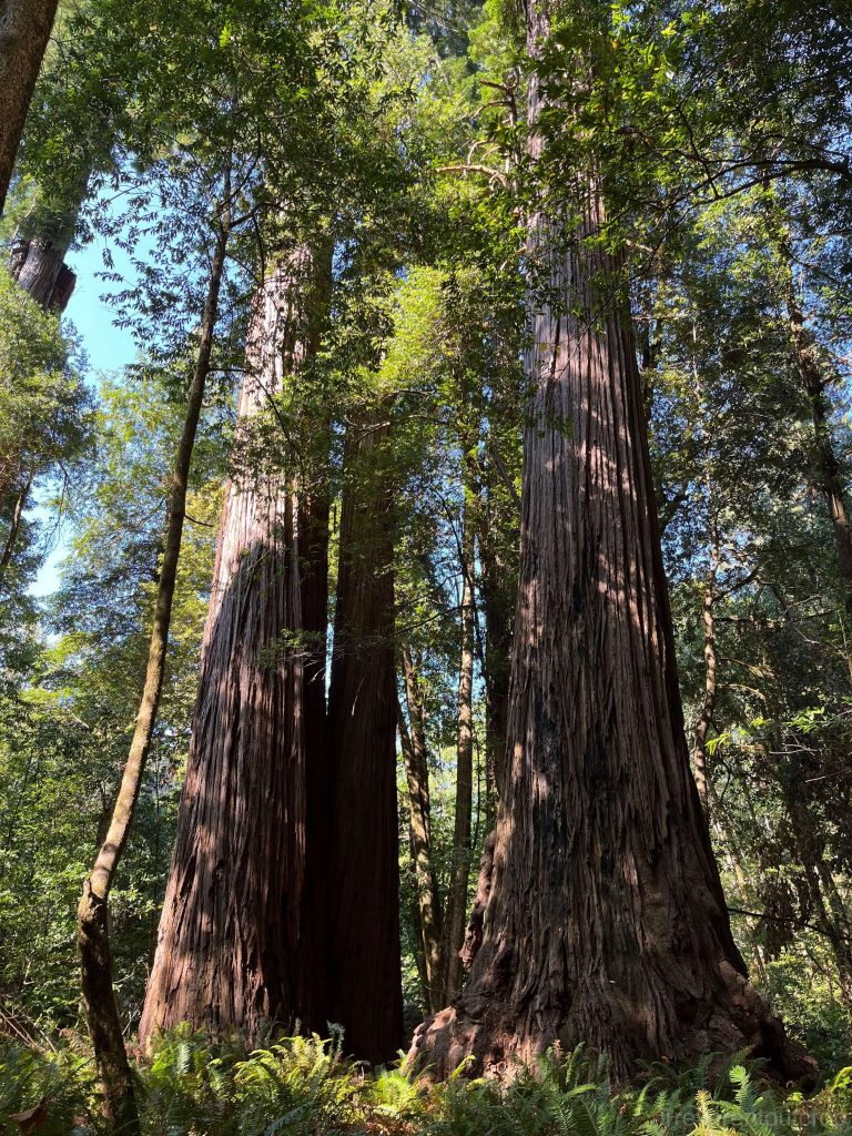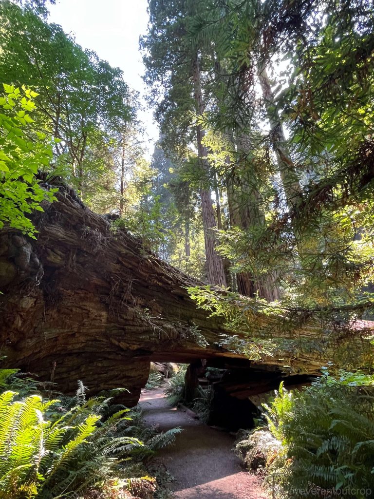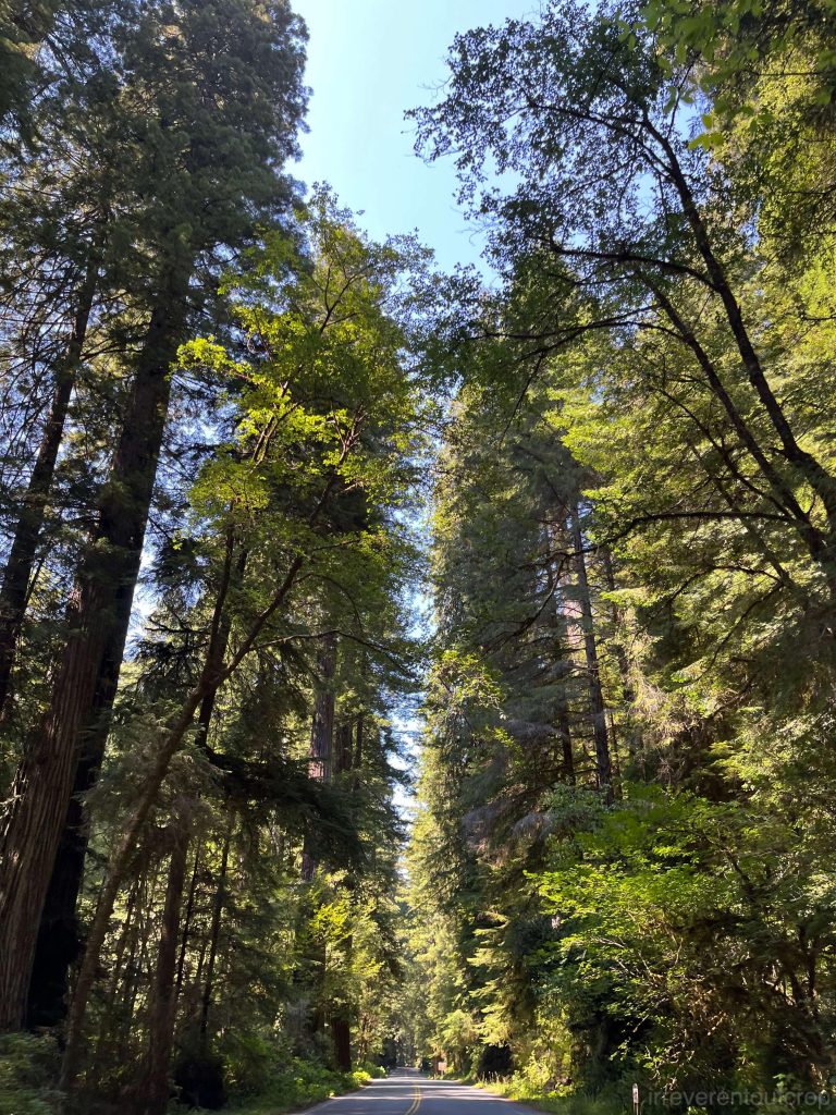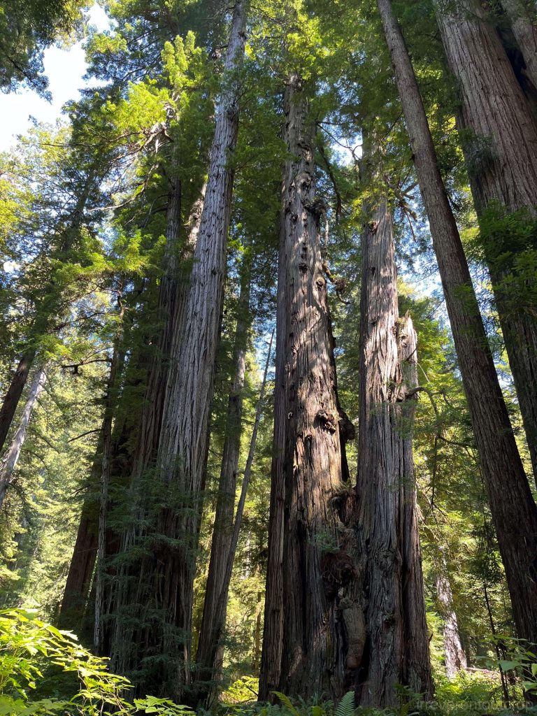 从胡帕部落继续西行,我们便从东侧进入了红木国家公园。这个区域属于加州海岸山脉,在20世纪初大量原生林被砍伐,为了挽救这些稀有的大树,1938年起当地居民就努力提案希望成立国家公园,但由于林业巨头的阻挠,一直拖到1968年这个国家公园才正式建成。我们去的时候,能看到林子的许多部分是次生林,还有许多长满苔藓的巨大树墩,当年砍伐的痕迹依旧明显。