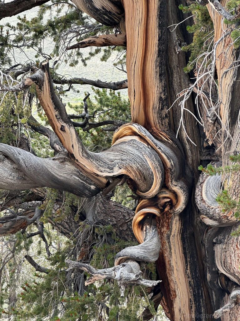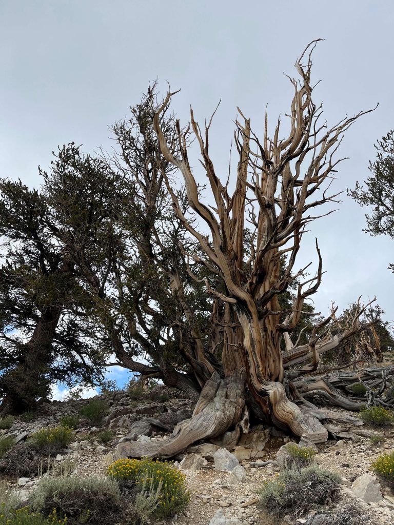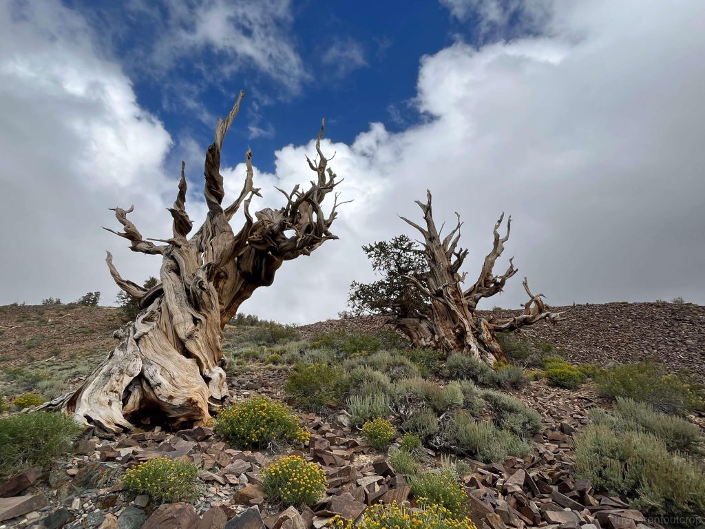 大盆地刺果松属于松柏目松科,仅分布在加州内陆到内华达州和犹他州的戈壁地带。我们从南加州前往猛犸湖地区游玩的中途走了个小岔路,去到了最老的这棵大盆地刺果松所在的因约国家森林(Inyo National Forest)。而他们集中分布的那个山头,叫白山(White Mountain)。