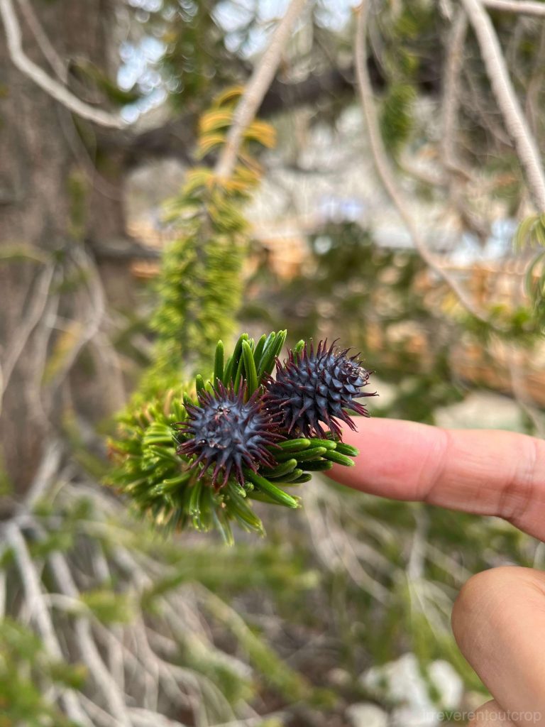 别看老,这些松树依旧繁殖能力旺盛,大部分都有结松果。未成熟的松果是紫色的,成熟的会是橙色,与绿色的针叶搭配起来,看着挺有意思。