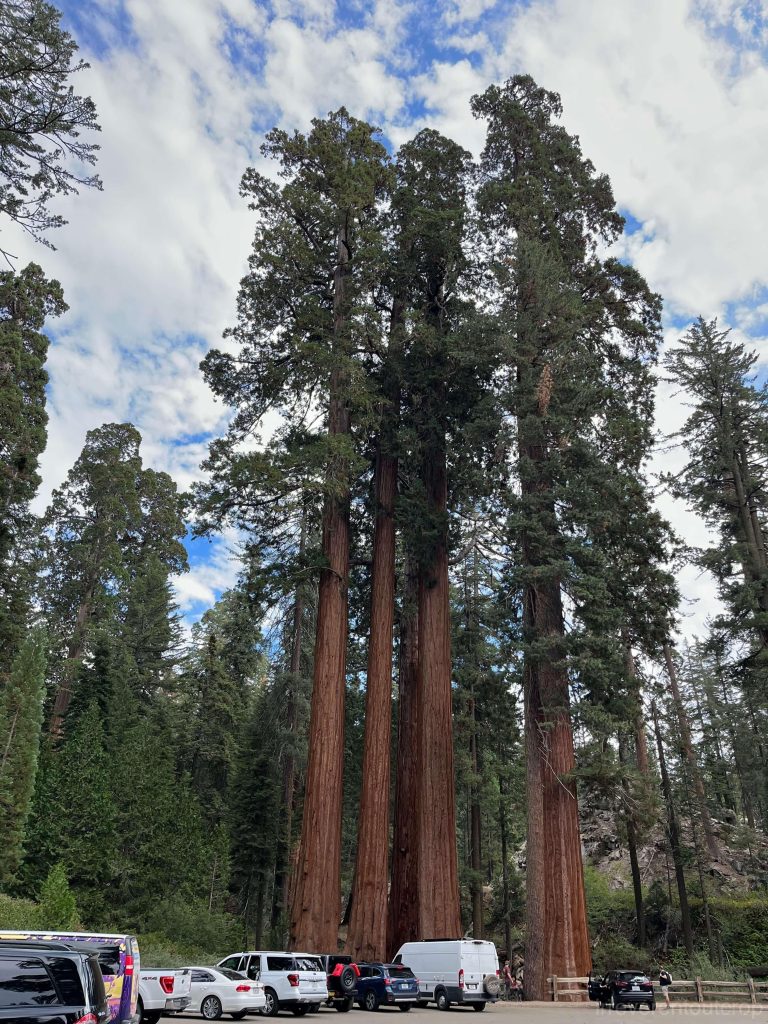 巨杉国家公园范围内大约有8000棵巨杉,每一棵都长得不一样。General Sherman附近照相时附近没有太方便的参照,下图停车场附近的这几棵有前面的汽车作为参照,可以更直观感觉巨杉的高度和体积。